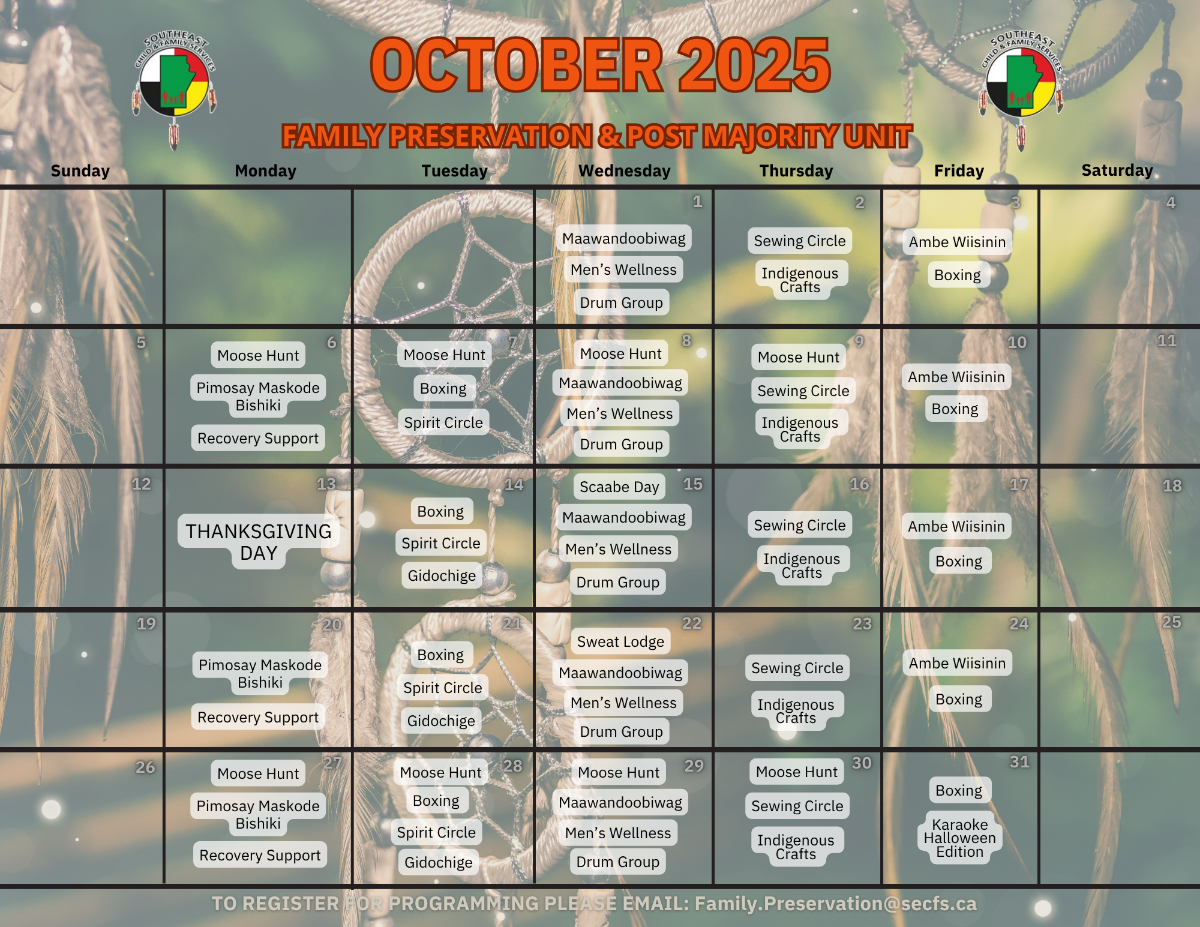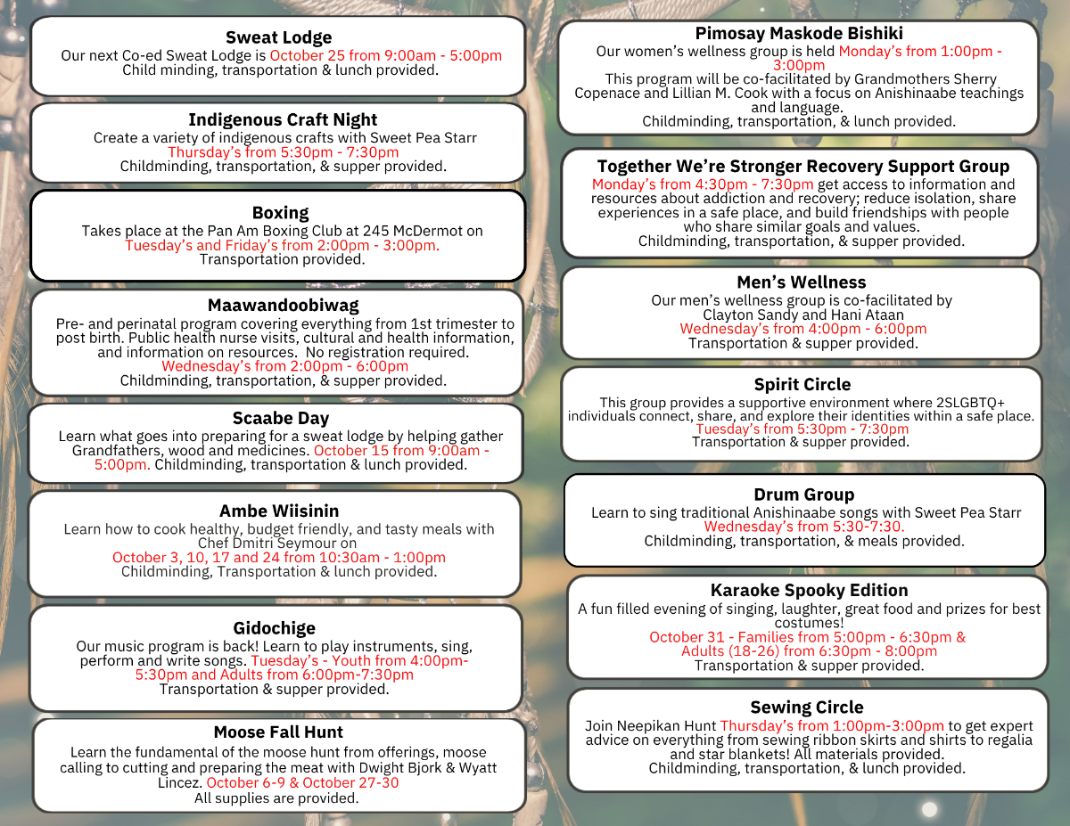 Youth and families have access to cultural based programs almost every evening of the week. Programs are offered n-person at our Southeast office located at 470 Notre Dame Ave.